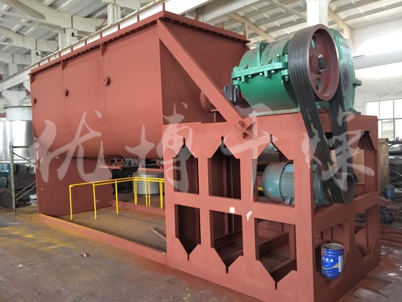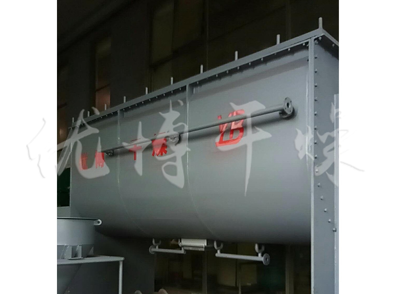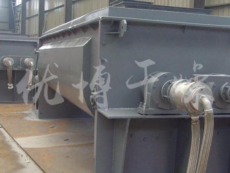 設(shè)備采用傳導(dǎo)加熱方式,由相互嚙合的兩根葉片軸,帶有夾層W型殼體機(jī)座及傳動(dòng)部分組成。污泥的整個(gè)干燥過(guò)程在封閉狀態(tài)下進(jìn)行,有機(jī)揮發(fā)物異味氣體及其水份在密閉氛圍下通過(guò)引風(fēng)裝置送至尾氣處理裝置,從而避免了對(duì)環(huán)境的污染。加熱介質(zhì)一般選用蒸汽、導(dǎo)熱油。加熱介質(zhì)分為兩路分別進(jìn)入干燥機(jī)殼體夾層和槳葉內(nèi)腔,將機(jī)腔和槳葉軸同時(shí)加熱,以傳導(dǎo)加熱的方式對(duì)污泥進(jìn)行干化處理。污泥進(jìn)入機(jī)腔后,通過(guò)槳葉的轉(zhuǎn)動(dòng)使污泥翻轉(zhuǎn)、攪拌,并不斷更新加熱界面,充分與加熱后的器身和槳葉接觸,從而使污泥的水份大量蒸發(fā),同時(shí)污泥隨葉片軸的轉(zhuǎn)動(dòng)向出料器輸送,后干燥均勻的污泥由出料口排出。